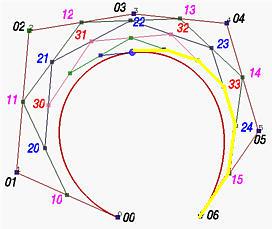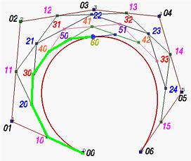 Ako pažljivo uporedimo ove dve slike, uočićemo da se leva poligonalna linija sastoji iz tačaka P00 = P0, P10, P20, P30, P40, P50 i P60 = C(u), dok je desna poligonalna linija određena tačkama P60 = C(u), P51, P42, P33, P24, P15 i P06 = P6. Na narednim slikama prikazan je način izbora ovih kontrolnih tačaka.